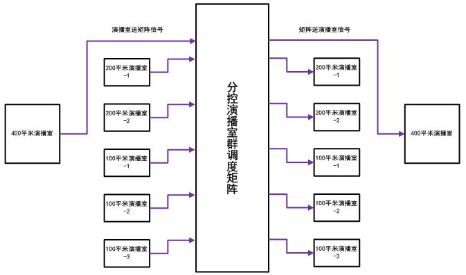 分控系统主要为4楼几个演播室集中调度设备及部分共享设备;400平米演播室主要做台里自办综艺性栏目使用;2个200平米演播室(1#,2#)和1个100平米演播室(4#)主要做台里自办新闻播报、评论类栏目使用,100平米演播室(3#)设计成可以做虚拟演播室用途,100平米演播室(5#)暂时作为备用演播室。