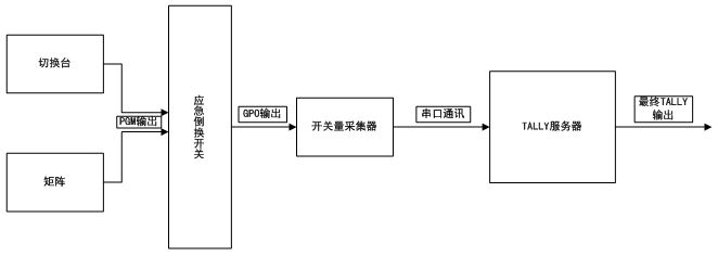如图4所示,TALLY系统使用了一个开关量采集器来采集应急倒换开关的状态并通过串口方式发送给TALLY服务器,TALLY系统以此作为主备状态倒换的依据,从而实现TALLY系统随着视音频一键倒换的功能。