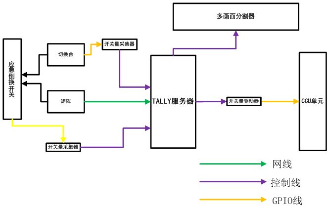 TALLY系统以应急倒换开关的状态作为调整依据(正常状态下是切换台工作,应急状态下是矩阵工作),来指导TALLY系统实现不同的切换设备的源名跟随和TALLY显示。