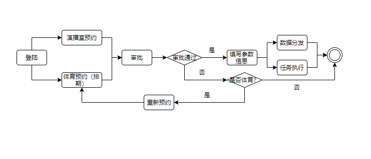 用户由演播室预约或体育预约处填写并申请预约单,经由演播中心管理人员审批通过后,生成任务单,再由演播中心工作人员填写相关预约单的任务参数,并提供API接口,供其他系统调用分发。